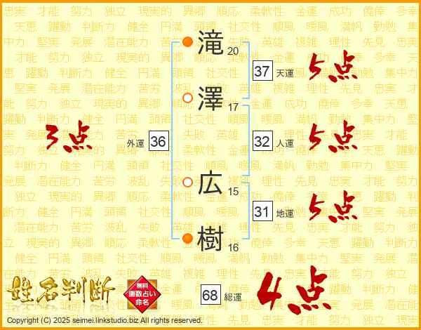 滝澤広樹さんの総運は68画の4点!