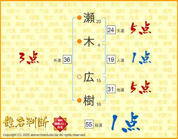 瀬(20画)木(4画) 広(15画)樹(16画)