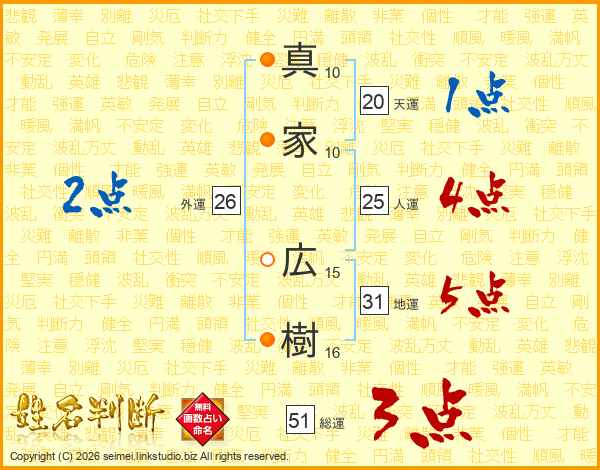 真(10画)家(10画) 広(15画)樹(16画)