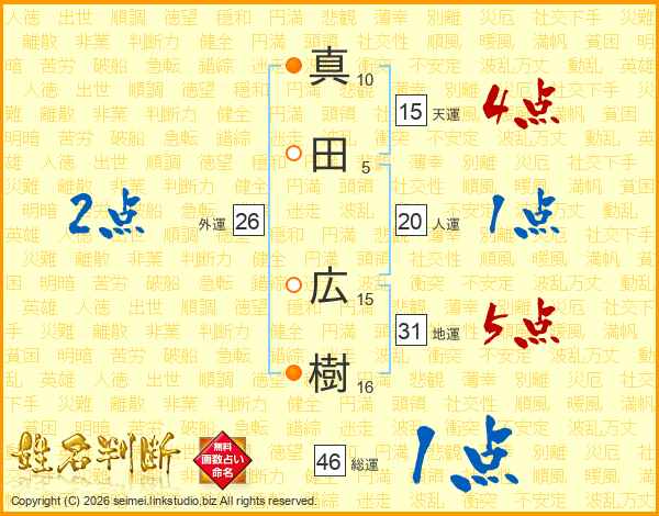 生活面を象徴する運勢です。外部から受ける影響力を表し、結婚運、家庭運や職場、環境への順応性を表します。総運から人運を引いた画数。姓や名が1文字の場合を除く。
