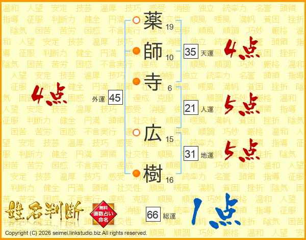 薬(19画)師(10画)寺(6画) 広(15画)樹(16画)