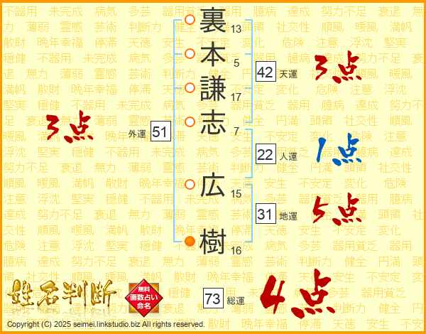 裏(13画)本(5画)謙(17画)志(7画) 広(15画)樹(16画)