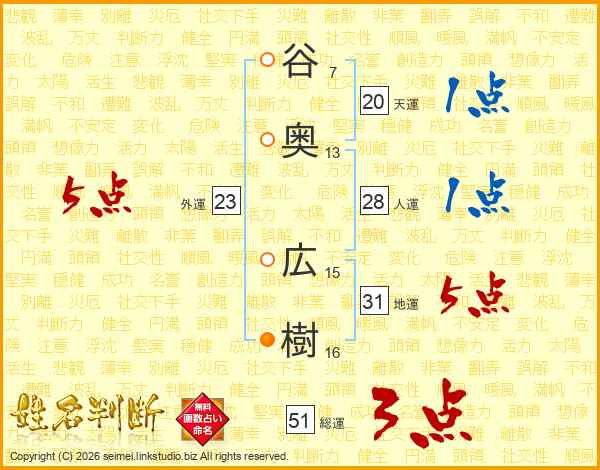 谷(7画)奥(13画) 広(15画)樹(16画)