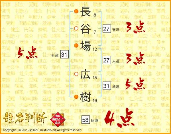 長(8画)谷(7画)場(12画) 広(15画)樹(16画)