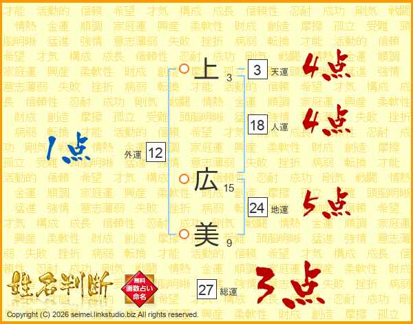 上広美さんの総運は27画の3点!
