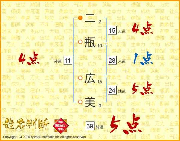 生活面を象徴する運勢です。外部から受ける影響力を表し、結婚運、家庭運や職場、環境への順応性を表します。総運から人運を引いた画数。姓や名が1文字の場合を除く。