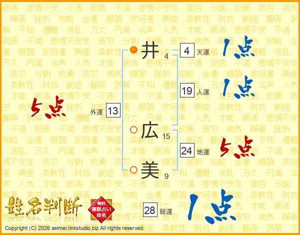 井(4画) 広(15画)美(9画)