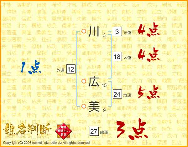 川(3画) 広(15画)美(9画)