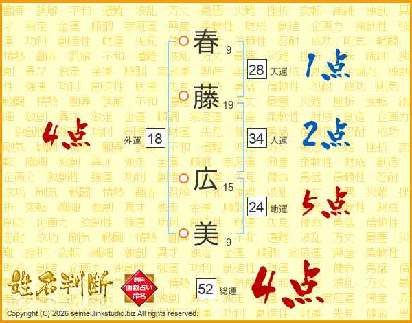 春藤広美さんの総運は52画の4点!