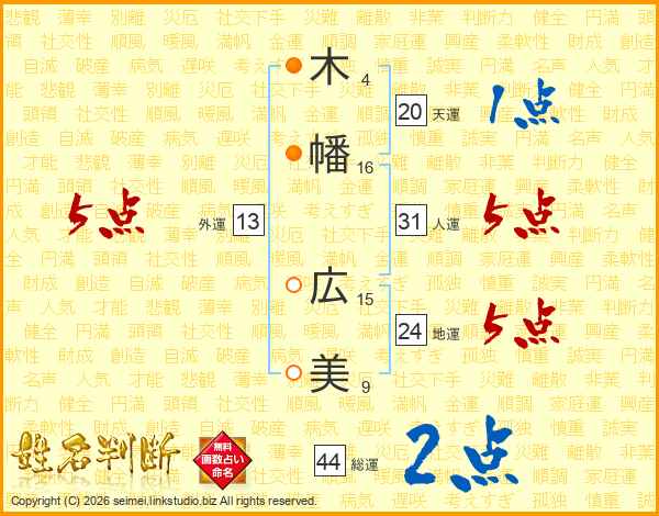 生活面を象徴する運勢です。外部から受ける影響力を表し、結婚運、家庭運や職場、環境への順応性を表します。総運から人運を引いた画数。姓や名が1文字の場合を除く。