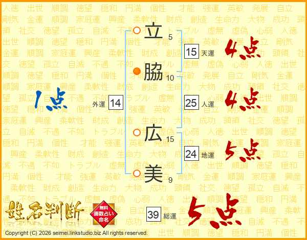 立(5画)脇(10画) 広(15画)美(9画)