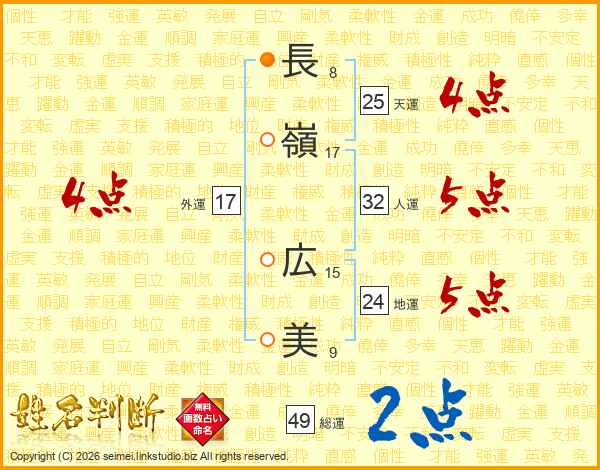 長(8画)嶺(17画) 広(15画)美(9画)