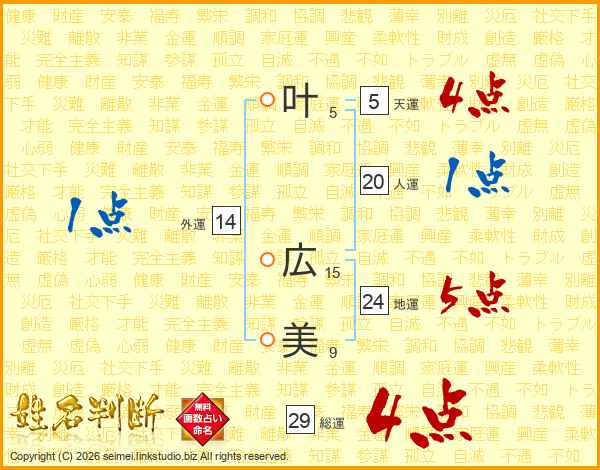 生活面を象徴する運勢です。外部から受ける影響力を表し、結婚運、家庭運や職場、環境への順応性を表します。総運から人運を引いた画数。姓や名が1文字の場合を除く。