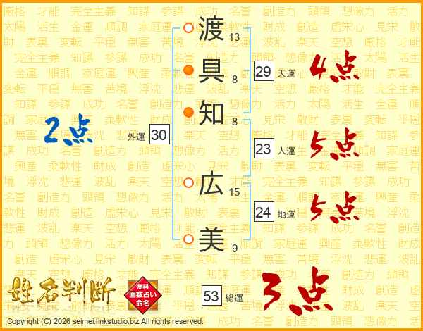 渡(13画)具(8画)知(8画) 広(15画)美(9画)
