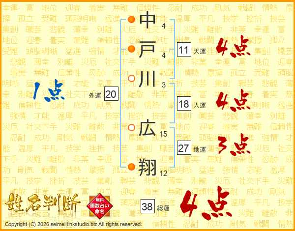 中戸川広翔さんの総運は38画の4点!