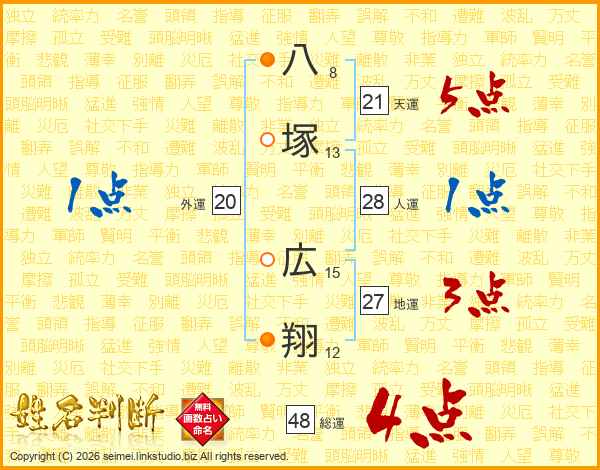 八塚広翔さんの総運は48画の4点!