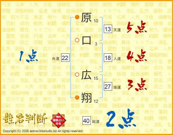 あなたの人生を表す1番重要な運勢です。生涯を通じて影響する総合運となり、主に50歳以降の晩年期に影響を及ぼします。苗字と名前の合計画数。