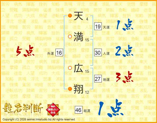 天(4画)満(15画) 広(15画)翔(12画)