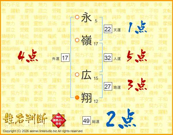 永(5画)嶺(17画) 広(15画)翔(12画)