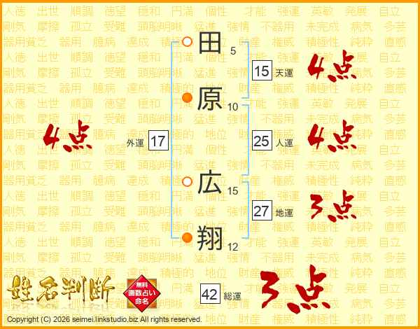 あなたの人生を表す1番重要な運勢です。生涯を通じて影響する総合運となり、主に50歳以降の晩年期に影響を及ぼします。苗字と名前の合計画数。