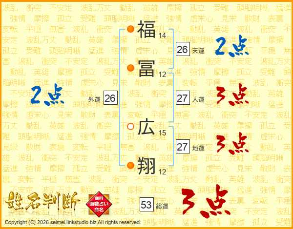 生活面を象徴する運勢です。外部から受ける影響力を表し、結婚運、家庭運や職場、環境への順応性を表します。総運から人運を引いた画数。姓や名が1文字の場合を除く。