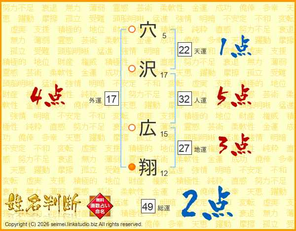 穴(5画)沢(17画) 広(15画)翔(12画)