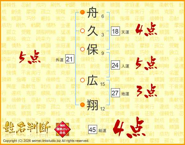 舟(6画)久(3画)保(9画) 広(15画)翔(12画)