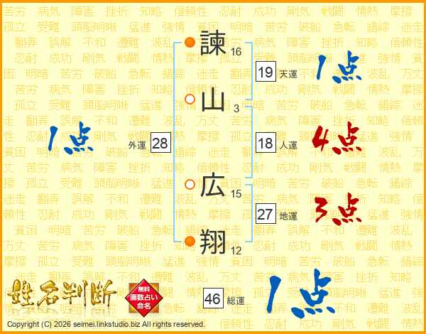 諫(16画)山(3画) 広(15画)翔(12画)