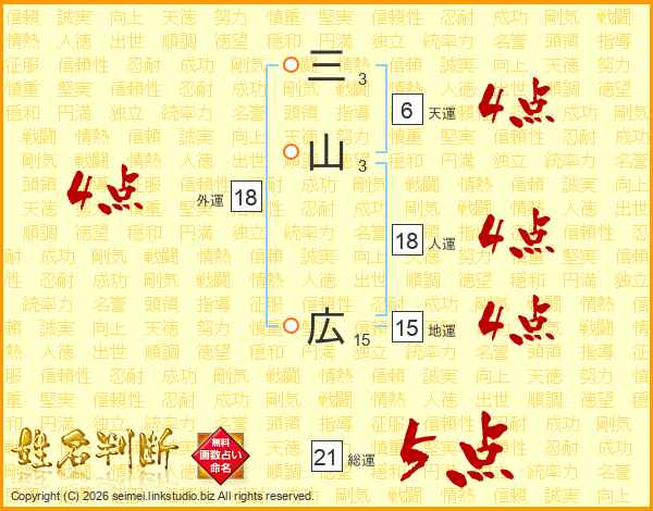 生活面を象徴する運勢です。外部から受ける影響力を表し、結婚運、家庭運や職場、環境への順応性を表します。総運から人運を引いた画数。姓や名が1文字の場合を除く。