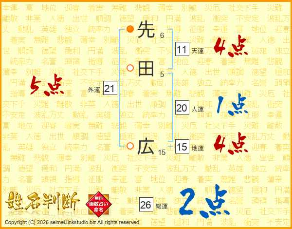 生活面を象徴する運勢です。外部から受ける影響力を表し、結婚運、家庭運や職場、環境への順応性を表します。総運から人運を引いた画数。姓や名が1文字の場合を除く。
