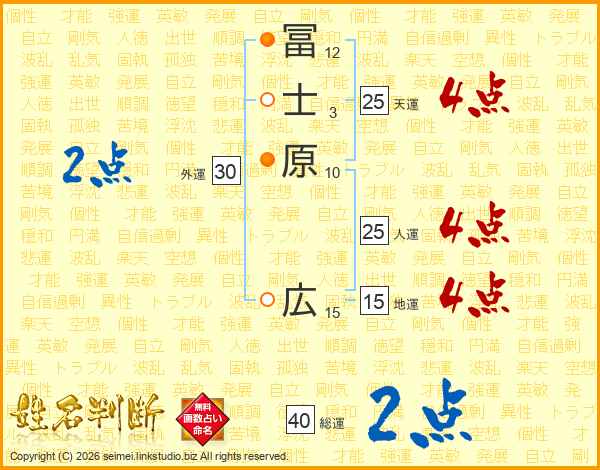 家系が持つ宿命的な運勢を表します。祖先から受け継いだ苗字ですので自分の力が及びません。家柄を象徴します。苗字の合計画数。