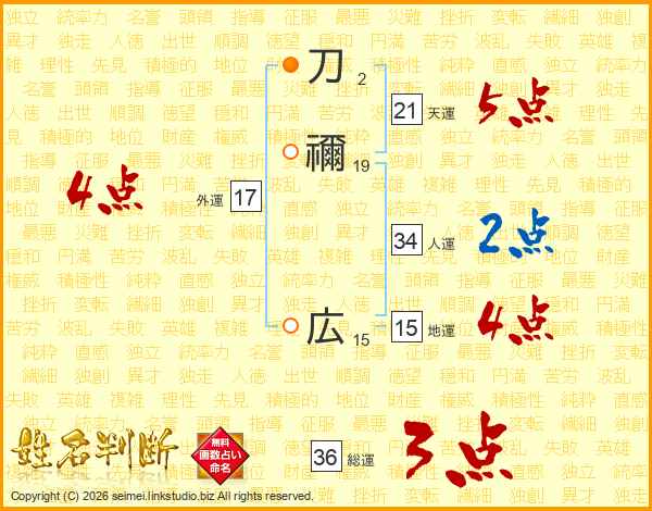 刀禰広さんの総運は36画の3点!