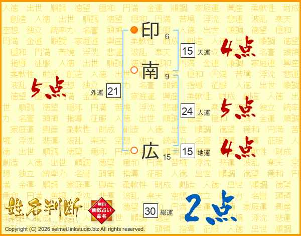 生活面を象徴する運勢です。外部から受ける影響力を表し、結婚運、家庭運や職場、環境への順応性を表します。総運から人運を引いた画数。姓や名が1文字の場合を除く。