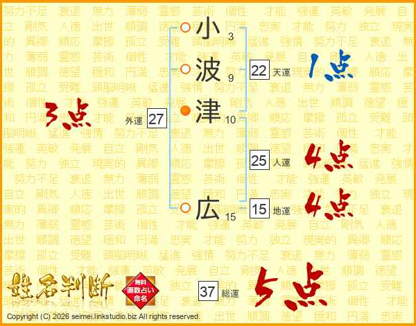 生活面を象徴する運勢です。外部から受ける影響力を表し、結婚運、家庭運や職場、環境への順応性を表します。総運から人運を引いた画数。姓や名が1文字の場合を除く。