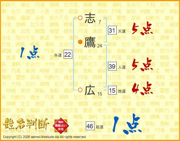あなたの人生を表す1番重要な運勢です。生涯を通じて影響する総合運となり、主に50歳以降の晩年期に影響を及ぼします。苗字と名前の合計画数。