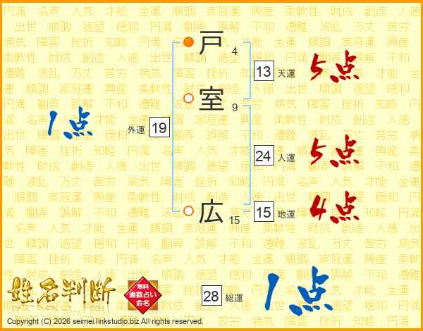 生活面を象徴する運勢です。外部から受ける影響力を表し、結婚運、家庭運や職場、環境への順応性を表します。総運から人運を引いた画数。姓や名が1文字の場合を除く。