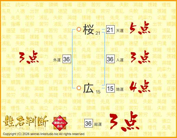 生活面を象徴する運勢です。外部から受ける影響力を表し、結婚運、家庭運や職場、環境への順応性を表します。総運から人運を引いた画数。姓や名が1文字の場合を除く。