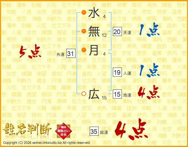 水(4画)無(12画)月(4画) 広(15画)