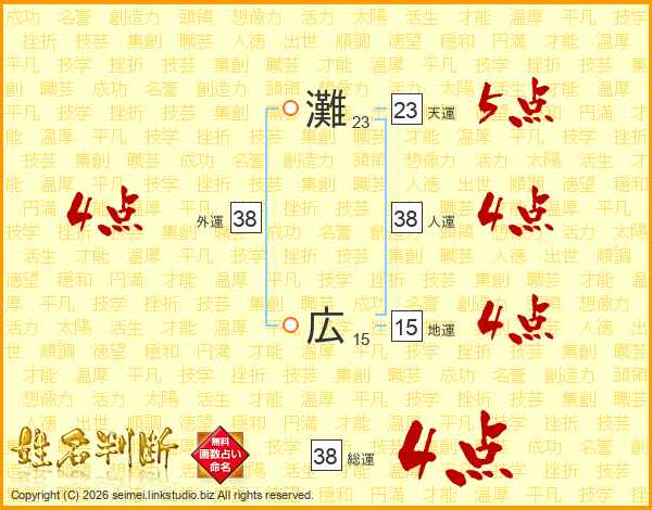 生活面を象徴する運勢です。外部から受ける影響力を表し、結婚運、家庭運や職場、環境への順応性を表します。総運から人運を引いた画数。姓や名が1文字の場合を除く。