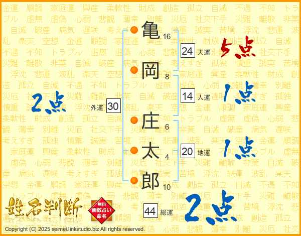 亀(16画)岡(8画) 庄(6画)太(4画)郎(10画)