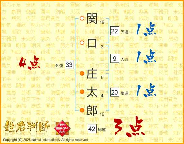 関(19画)口(3画) 庄(6画)太(4画)郎(10画)