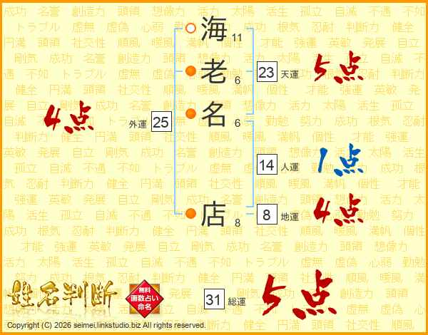 海(11画)老(6画)名(6画) 店(8画)