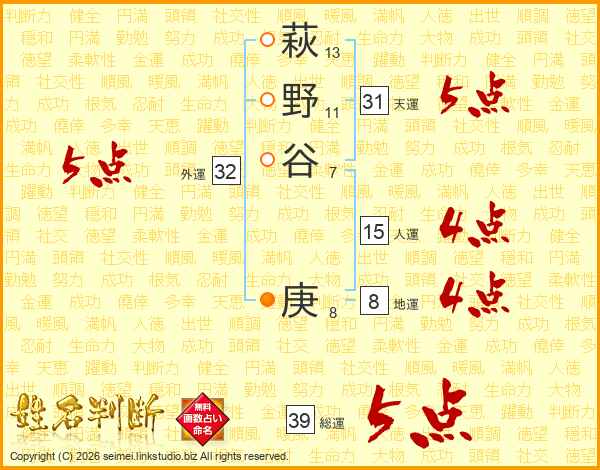 萩野谷庚さんの総運は39画の5点!