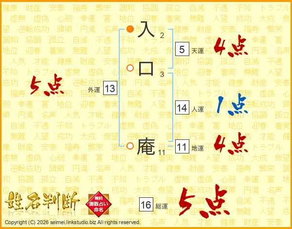 入口庵さんの総運は16画の5点!