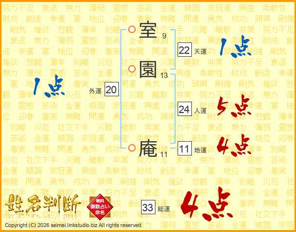生活面を象徴する運勢です。外部から受ける影響力を表し、結婚運、家庭運や職場、環境への順応性を表します。総運から人運を引いた画数。姓や名が1文字の場合を除く。