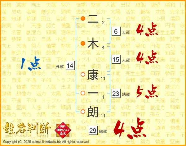 二(2画)木(4画) 康(11画)一(1画)朗(11画)