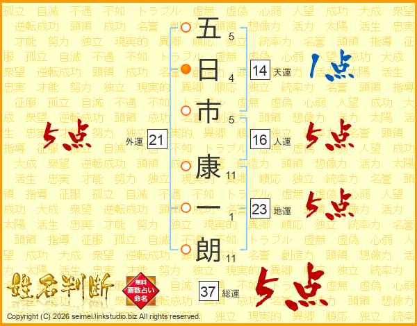 五(5画)日(4画)市(5画) 康(11画)一(1画)朗(11画)