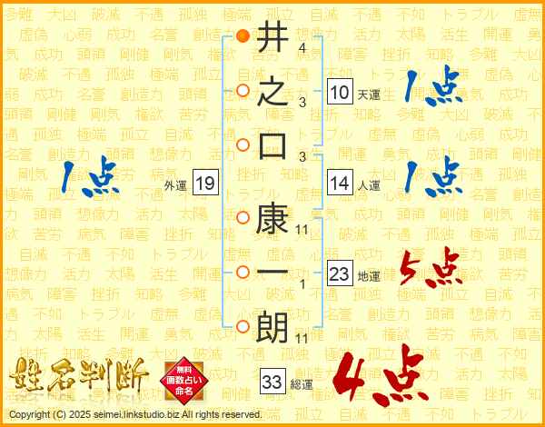 井(4画)之(3画)口(3画) 康(11画)一(1画)朗(11画)