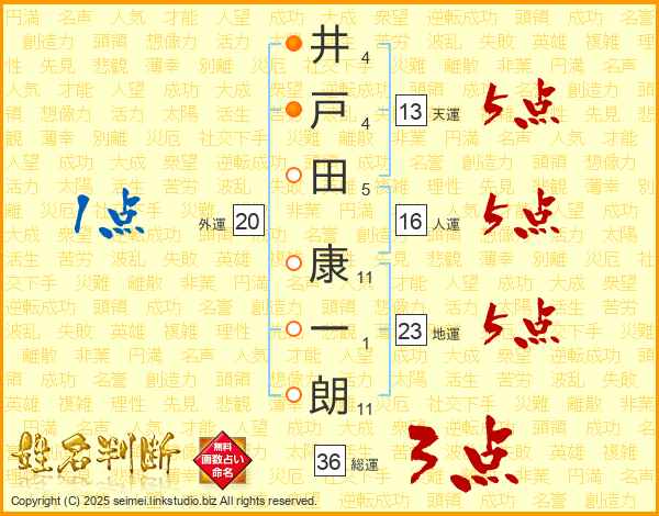 井(4画)戸(4画)田(5画) 康(11画)一(1画)朗(11画)