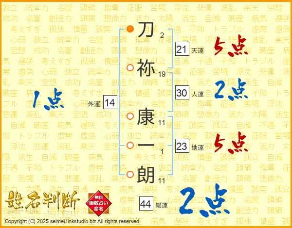 刀(2画)祢(19画) 康(11画)一(1画)朗(11画)
